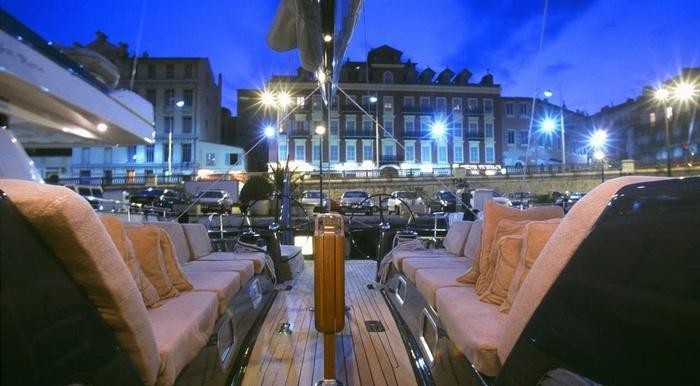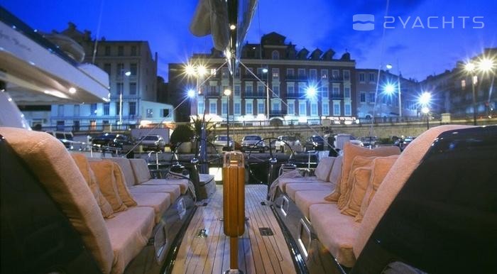 With a beam of 5.27 m and a draft of 3.6 m, she has a composite hull.
