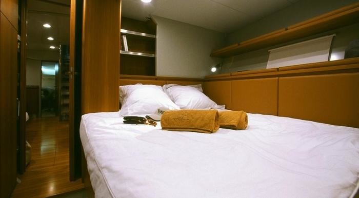 The sailing yacht can accommodate guests in 3 cabins with an interior design by Luca Brenta/Maxi Dolphin/Steve Huish