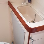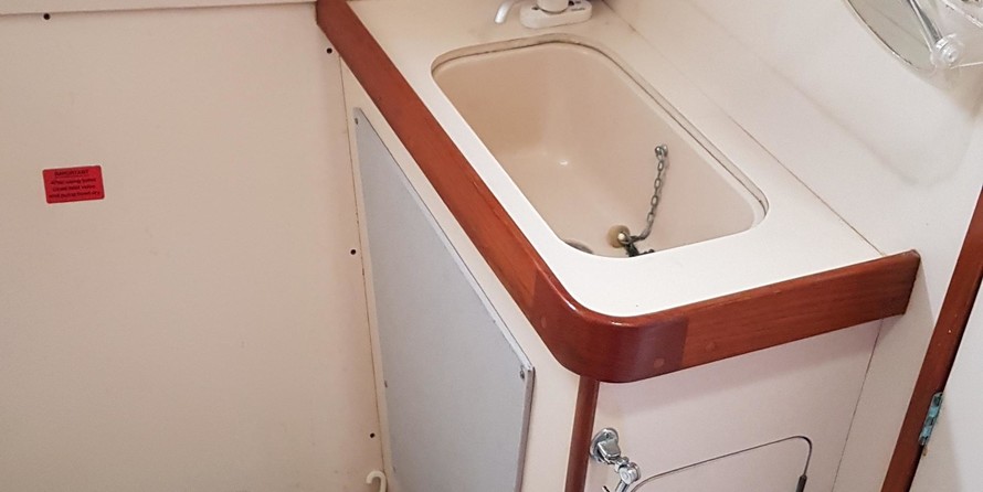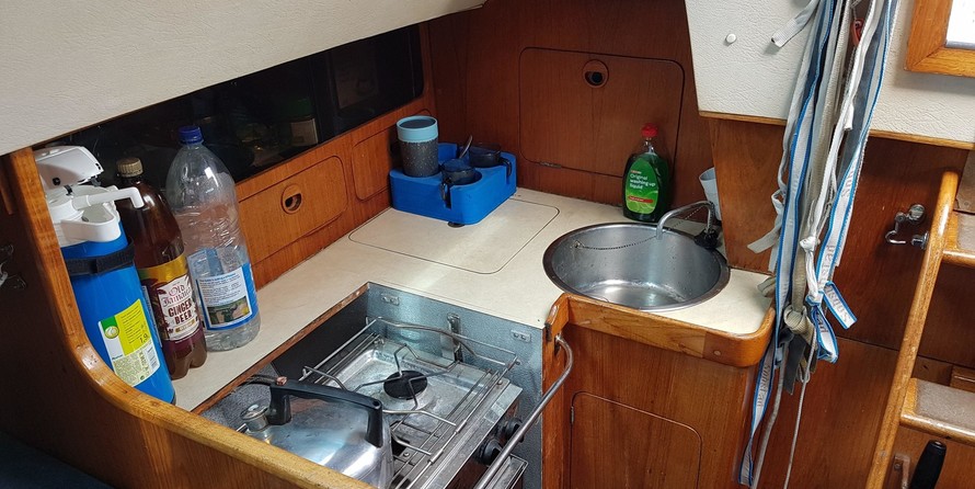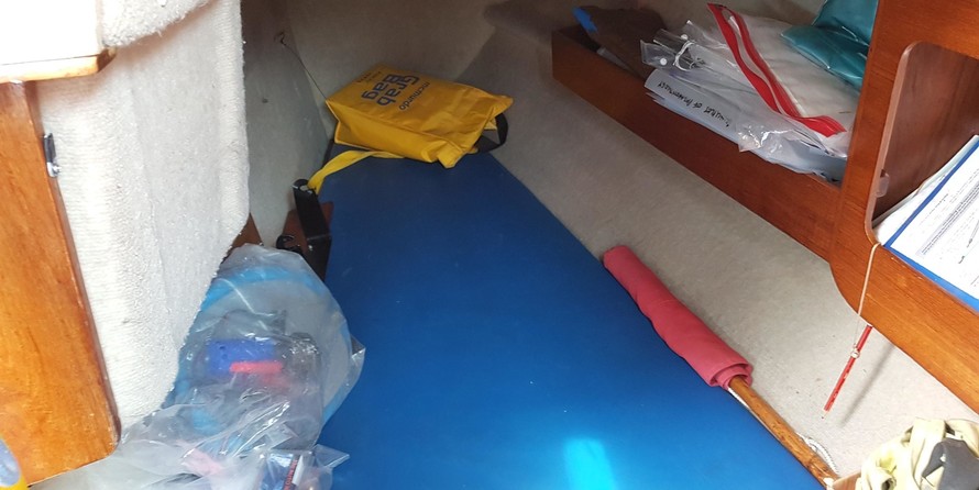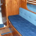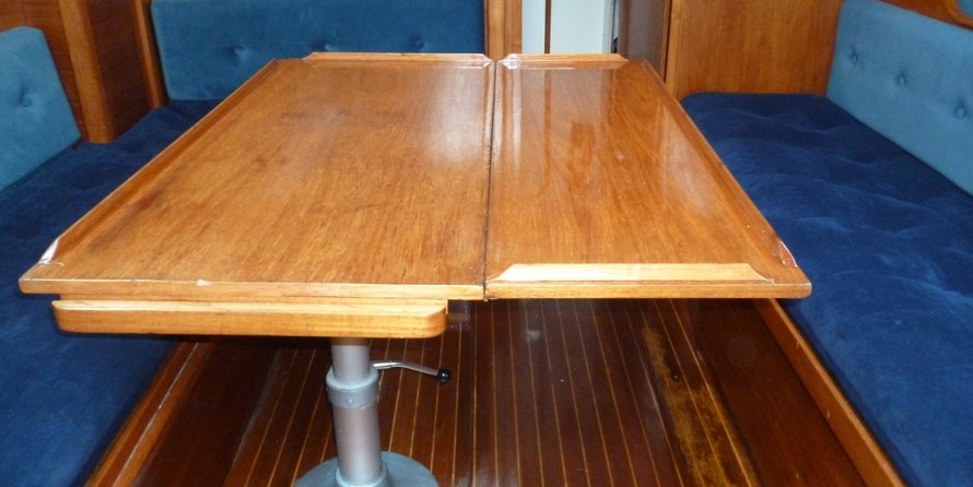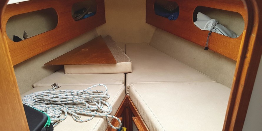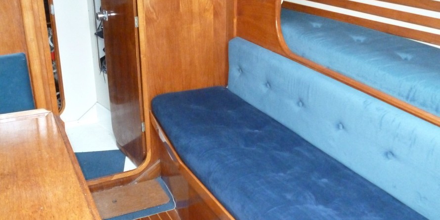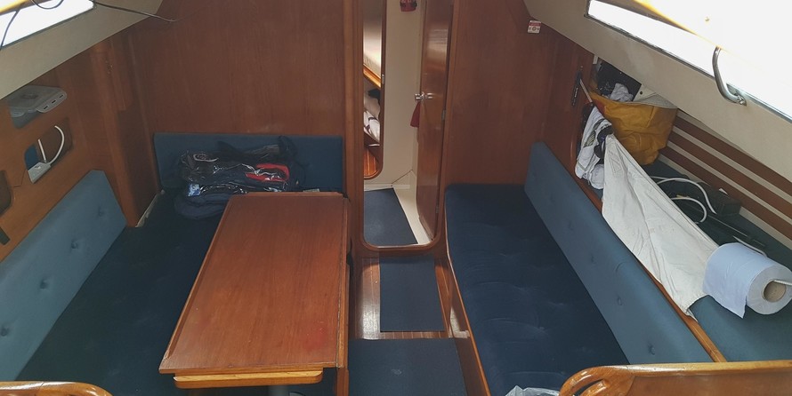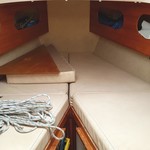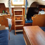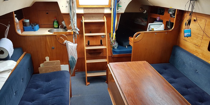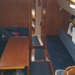 7 berths, 2 cabins, wood cabin sole, chart table, saloon table, wet locker, sea toilet, wash basin, grill/oven, cooker, gallery sink, refrigerating cool box, crockery, cuttlery, 2 gas cylinders.