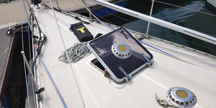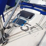 Fractional rig, stainless steel standing rigging (new in 2014), mainsail reefed to cockpit, spinnaker pole, Selden spars, Furlex headsail furling, anchor, 2 forehatches, cockpit table, 6 warps, fenders, anchor locker, stanchions/guardwires, boathook, mainsail cover, sprayhood.
