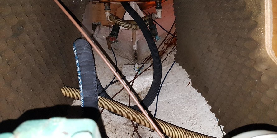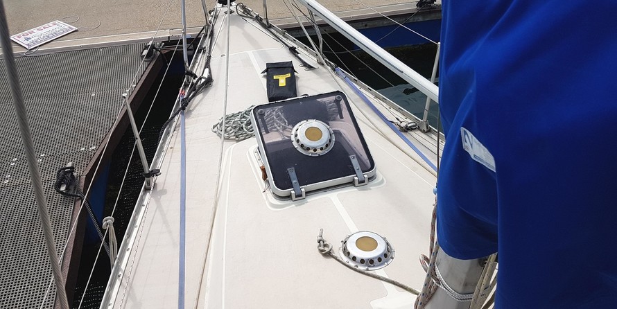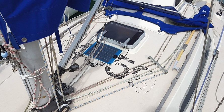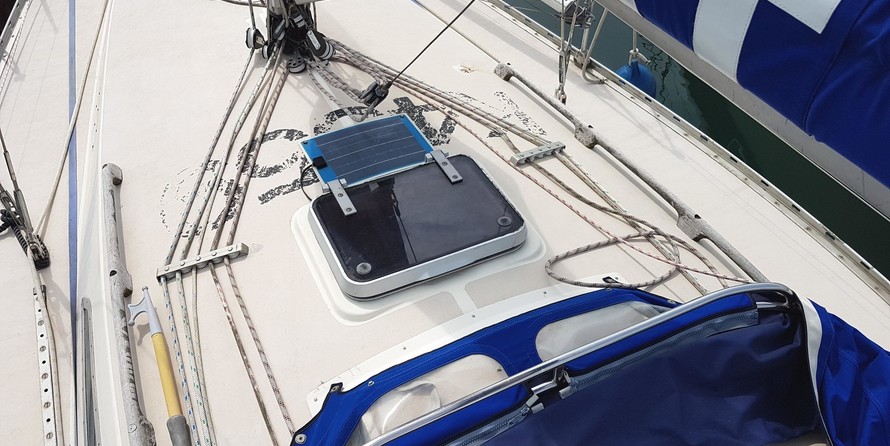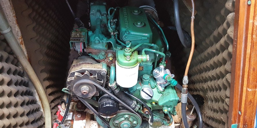 Volvo Penta 18hp Diesel (2002). Serial number: FL1875. Last serviced: April 2019. 2 fuel tanks. Maximum speed under power: 6 knots. 2 batteries charged from the enginea. Solar panels. Shore power. Folding prop with rope cutler.
