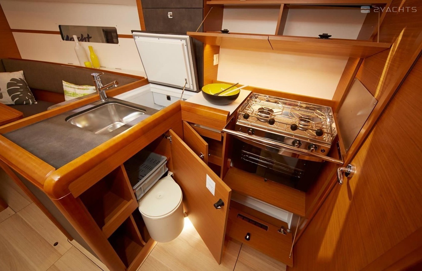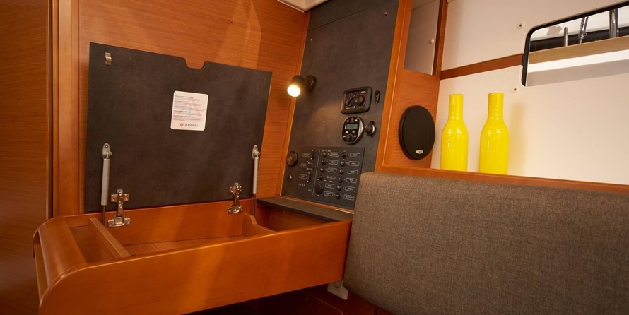 Boat equipment features rolling mainsail, solar panels, bimini and bow thruster. It also boasts a flat screen tv, an audio system, outside speakers and inside speakers. The fully-equipped galley includes a microwave, freezer, oven, cooker and sink.