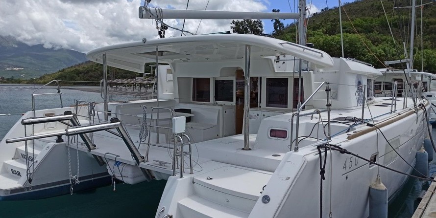 6-cabin catamaran Lagoon 450 F - Natasha was built in 2013, and it is docked in Marina Solila, Montenegro.