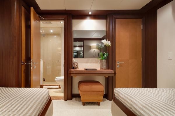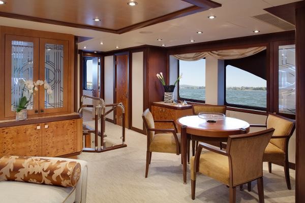 DREAM WEAVER meets all of the key metrics of a much larger yacht while still able to dock and explore in the most desirable cruising grounds. Interior volume is greater than that of a Westport 130. The five stateroom, tri-deck arrangement plan does not overreach; staterooms and common spaces are expansive. Crew comfort, with accommodations forward on the lower deck, was a major consideration; captain’s cabin is adjacent to the pilothouse.