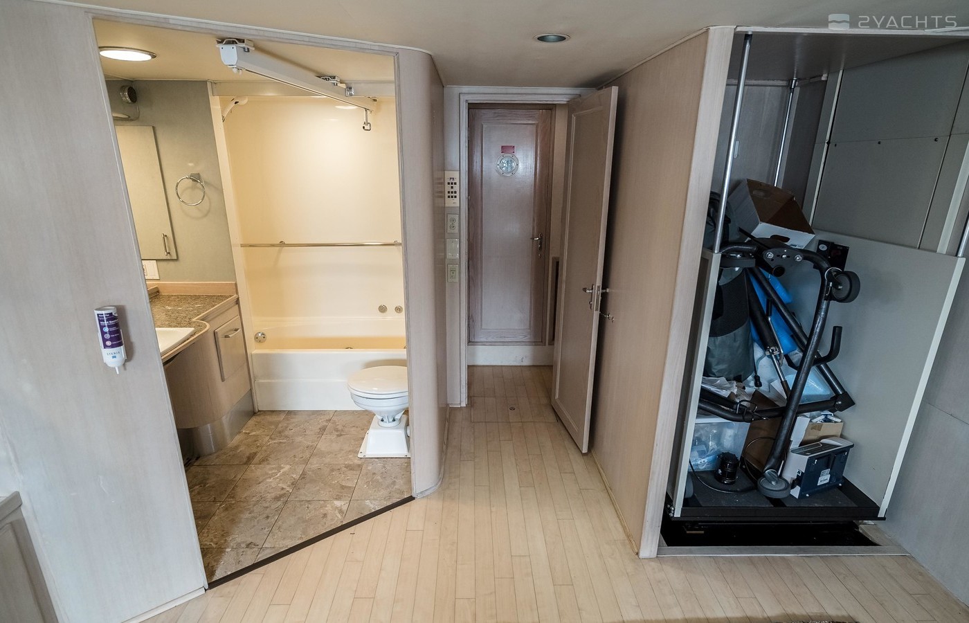 If not needed, the master stateroom can be easily reconverted back to a king-berth configuration, and elevator lift changed back to walk-in closet.