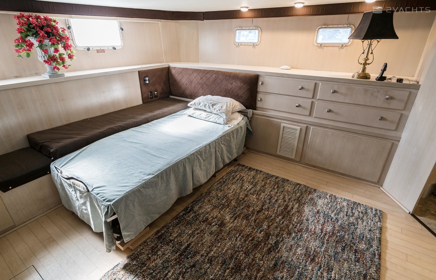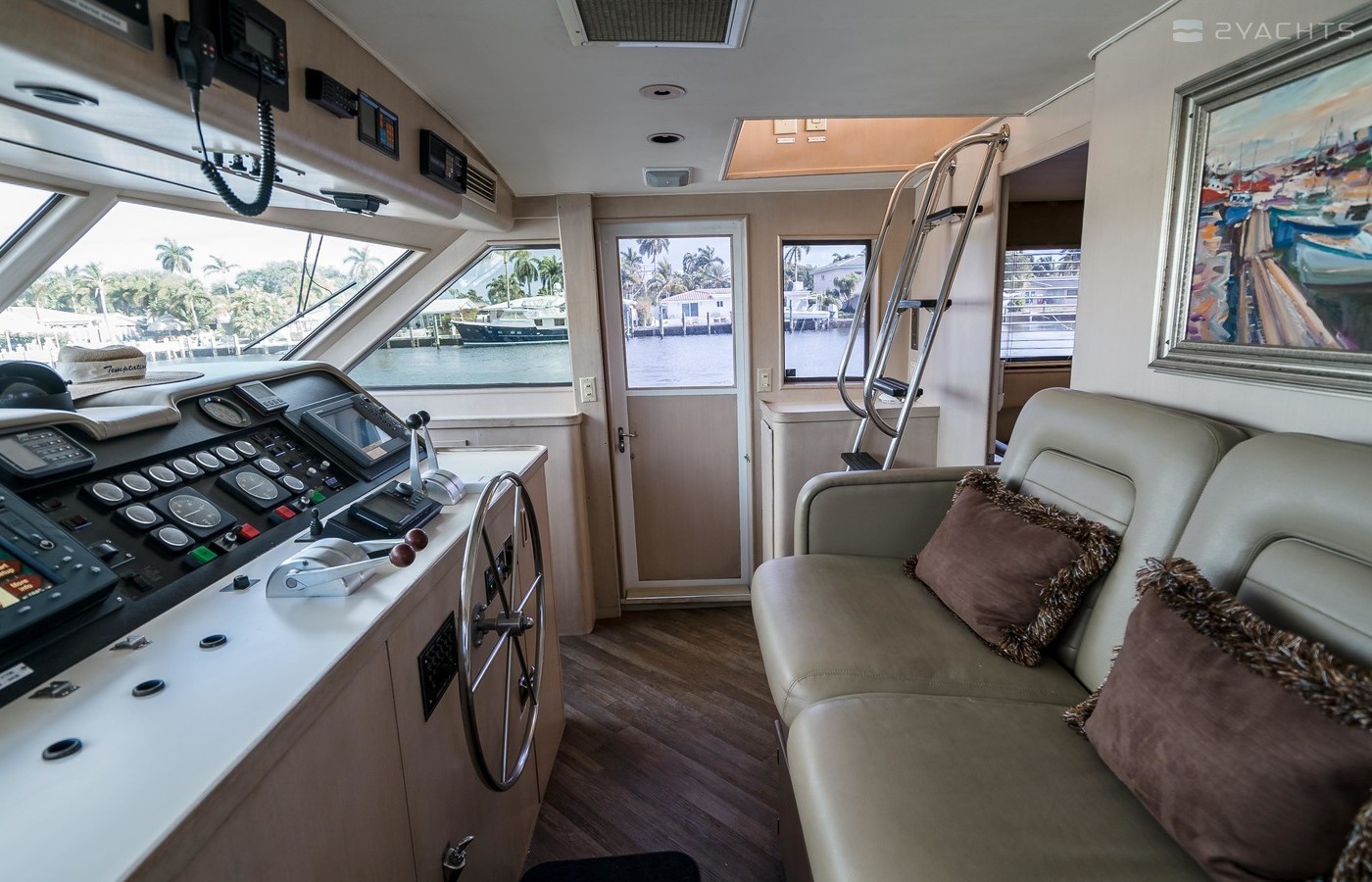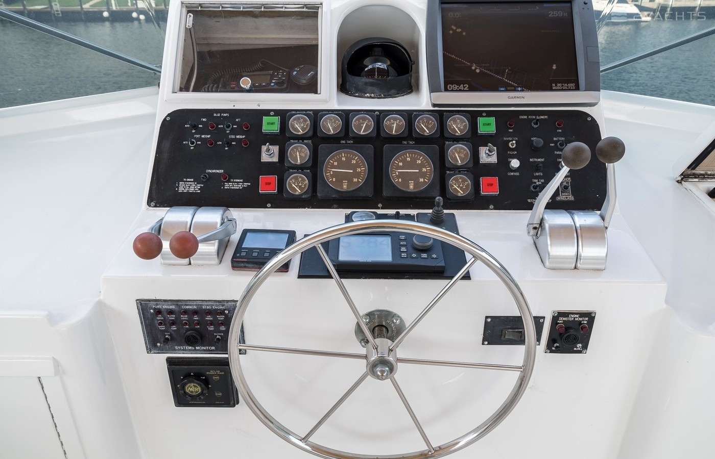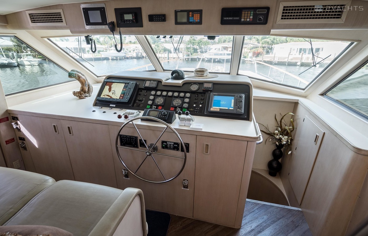 This boat has well-cared for and it shows. There were a number of refits completed throughout her life which included a “brilliant white” paint job, a full overhaul of the engines, addition of a vetus bow thruster and Naiad stabilsers, Phasor generator, and interior updates (finishes, soft goods, countertops, appliances, etc.).