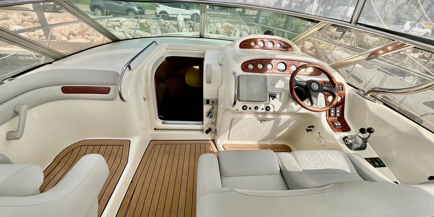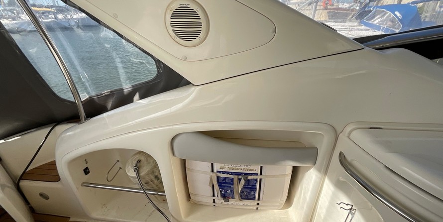 À l’extérieur sur le pont la sellerie est neuve ainsi que le taud intégral, La plage arrière du bateau a eu une extension de 50 cm.