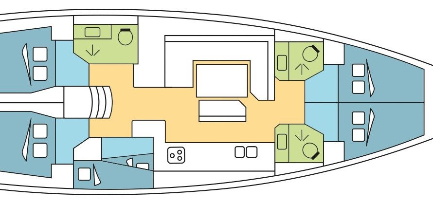 Salieri can accommodate up to 12 people in 4 double cabins, 1 double cabin with a bunk bed and a saloon with 2 extra beds. Pillows and blankets are included in the price.
