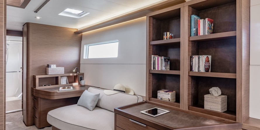 Boat equipment features classical mainsail, electric winches, generator, bimini and outside gps plotter. It also boasts a heating, air conditioning, an audio system, outside speakers and flybridge. The fully-equipped galley includes a microwave, dishwasher, freezer, oven and cooker.