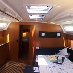 Boat equipment features rolling mainsail, solar panels, bimini and bow thruster. It also boasts a flat screen tv, heating, air conditioning, an audio system and outside speakers. The fully-equipped galley includes an oven, cooker, sink and kitchen utensils.
