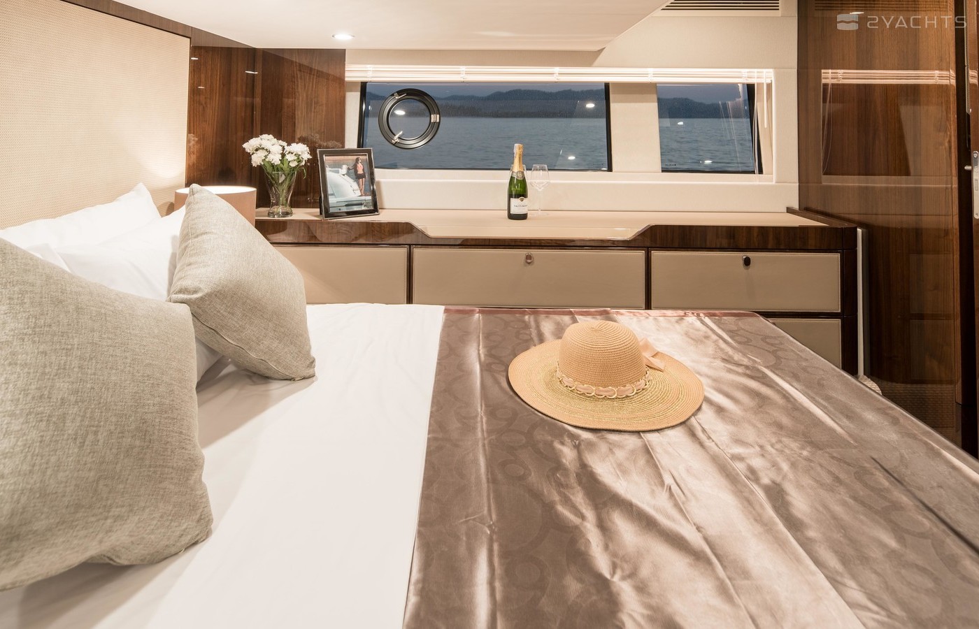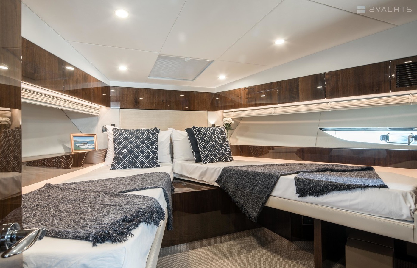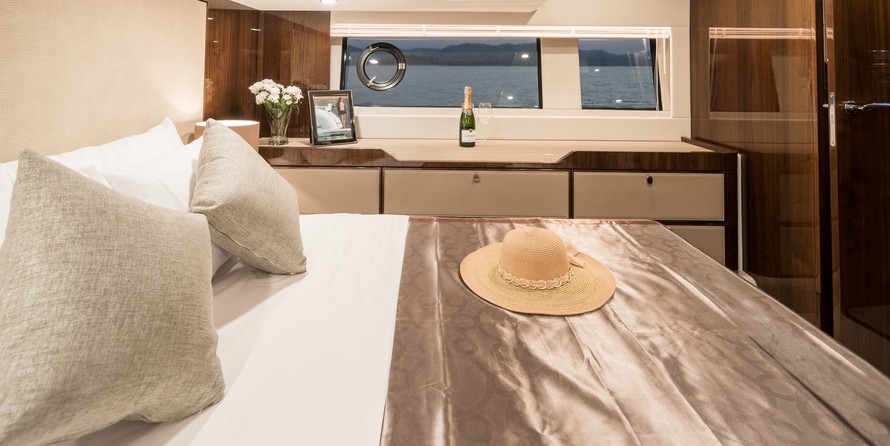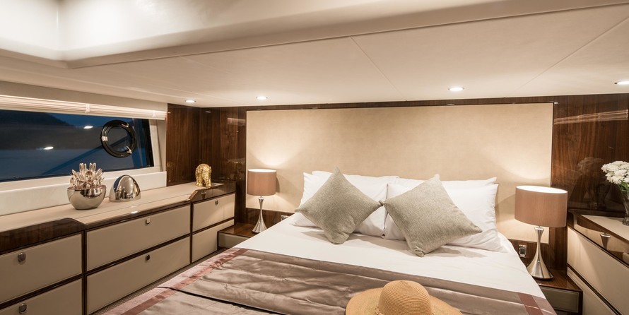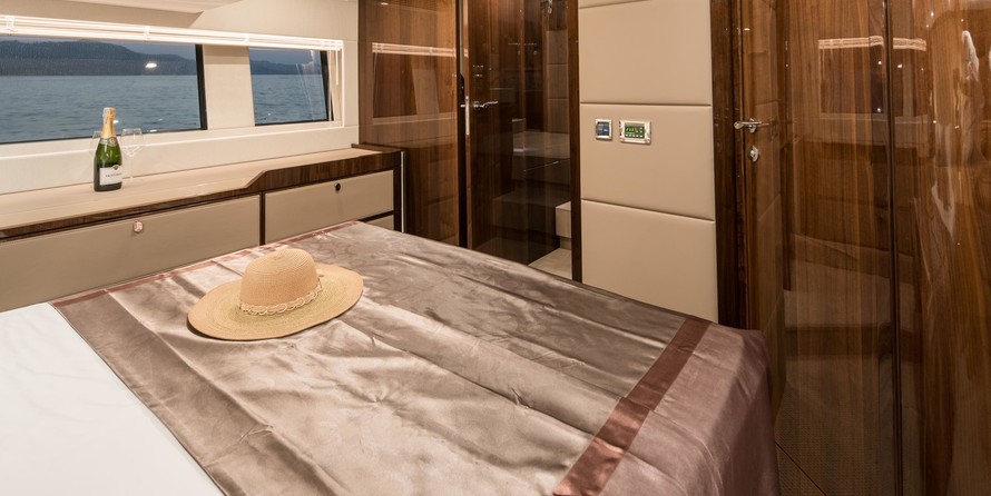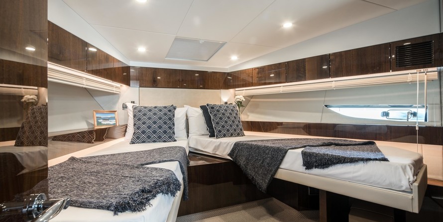 This example has the preferred three cabin layout with the upgraded galley up configuration allowing plenty of accommodation and the added bonus of the social galley up layout. Benefiting from a host of options including a hydraulic high/low platform, air conditioning, Seakeeper gyroscopic stabiliser, Humphree interceptors, dynamic positioning system and the Squadron premium pack.