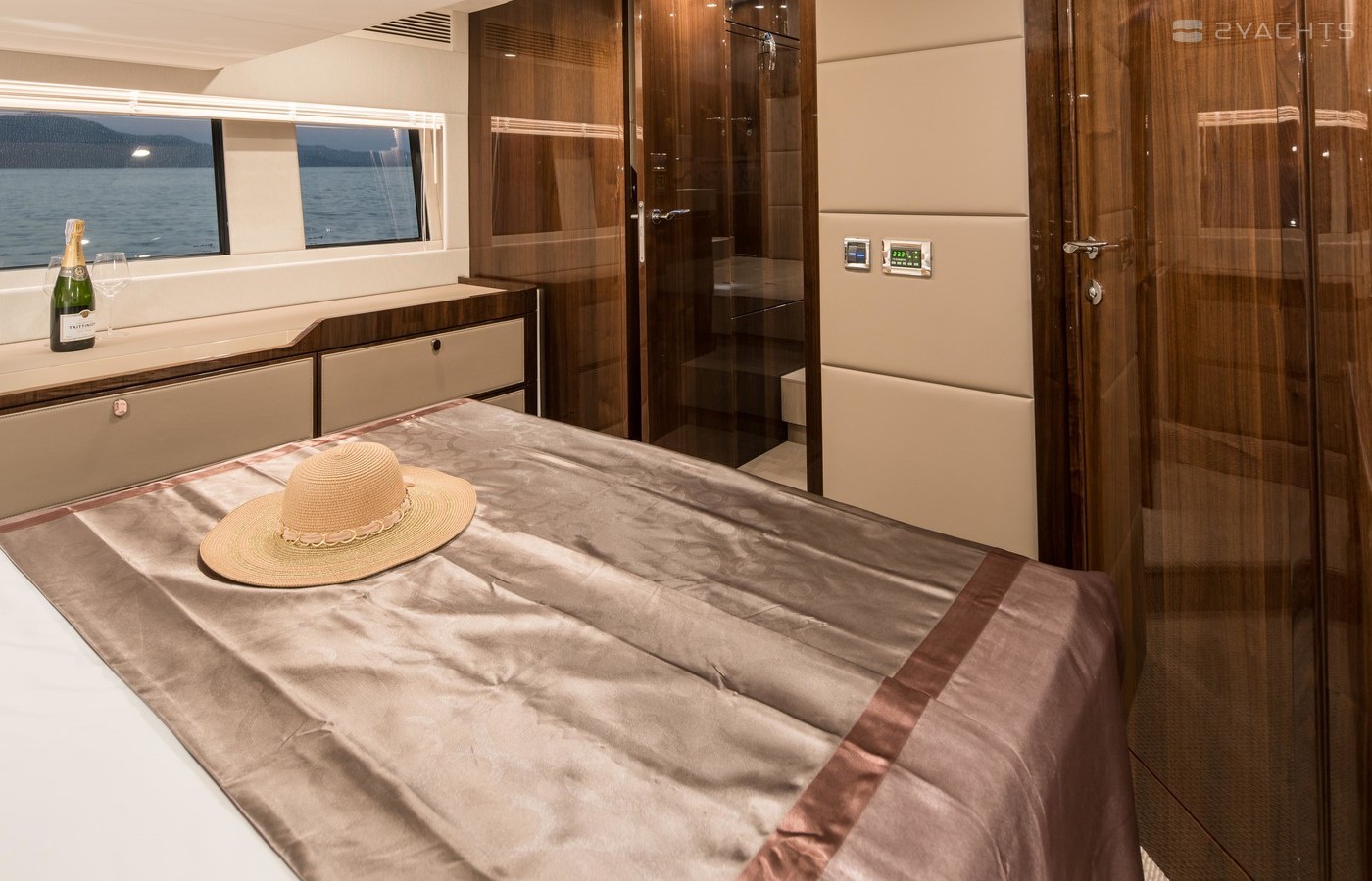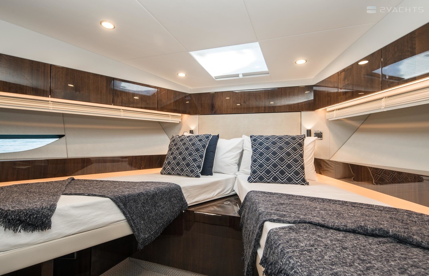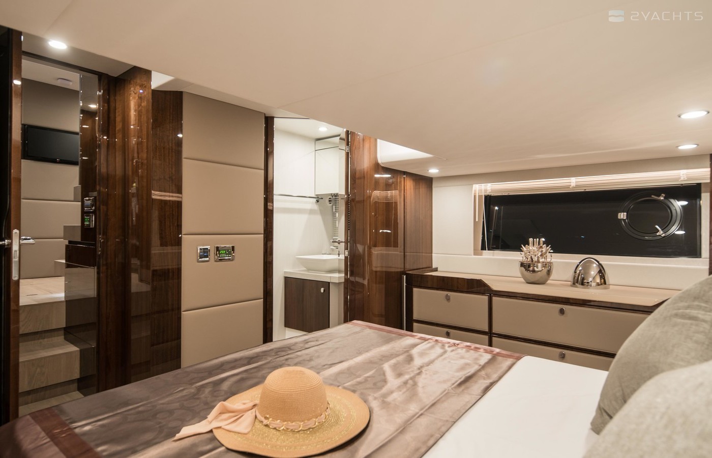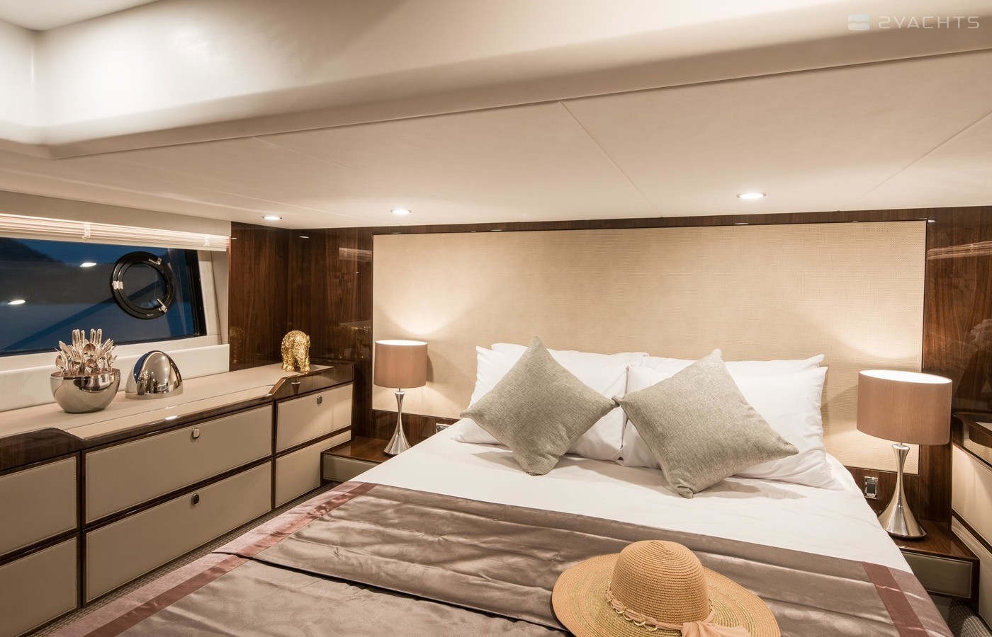 This example has the preferred three cabin layout with the upgraded galley up configuration allowing plenty of accommodation and the added bonus of the social galley up layout. Benefiting from a host of options including a hydraulic high/low platform, air conditioning, Seakeeper gyroscopic stabiliser, Humphree interceptors, dynamic positioning system and the Squadron premium pack.
