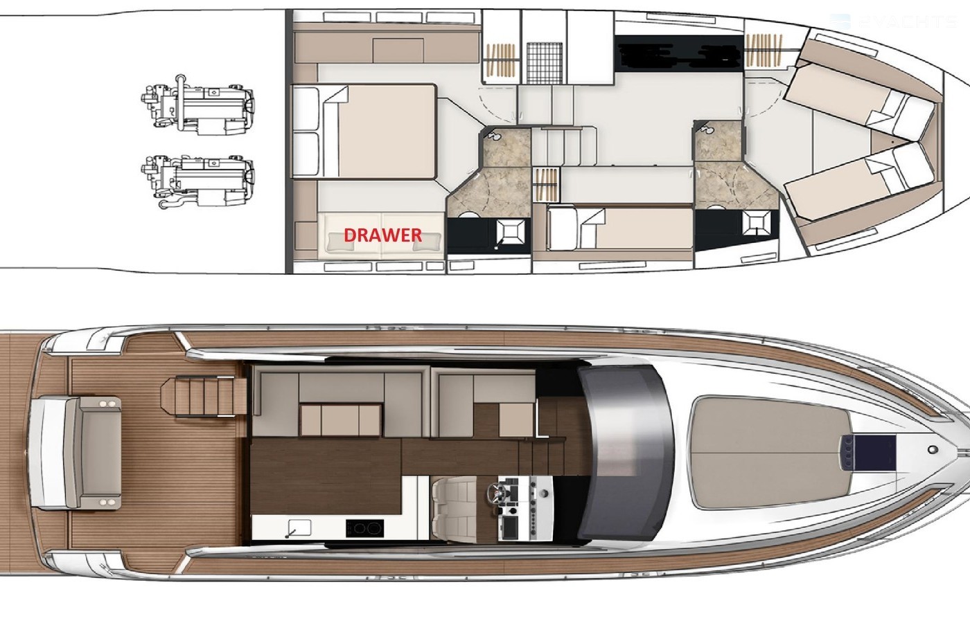 Access to bathing platform, flybridge, side decks on each side and engine room