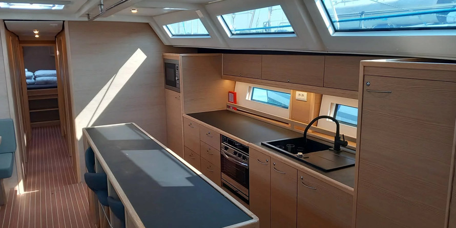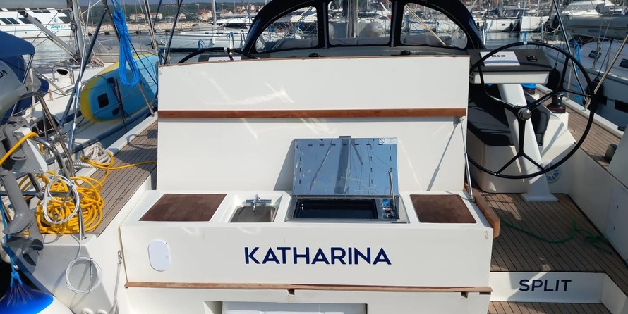 - BBQ grill, sink and teak covered countertop in cockpit