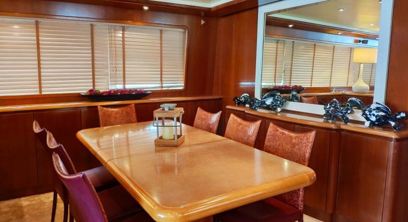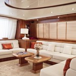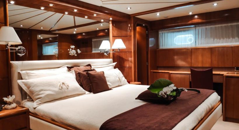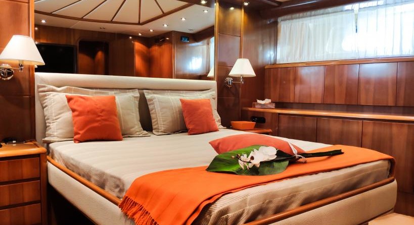 Le motor yacht peut accueillir 8 personnes dans 4 cabines avec un design d'intérieur par Falcon et un extérieur design by Stefano Righini de Conception.