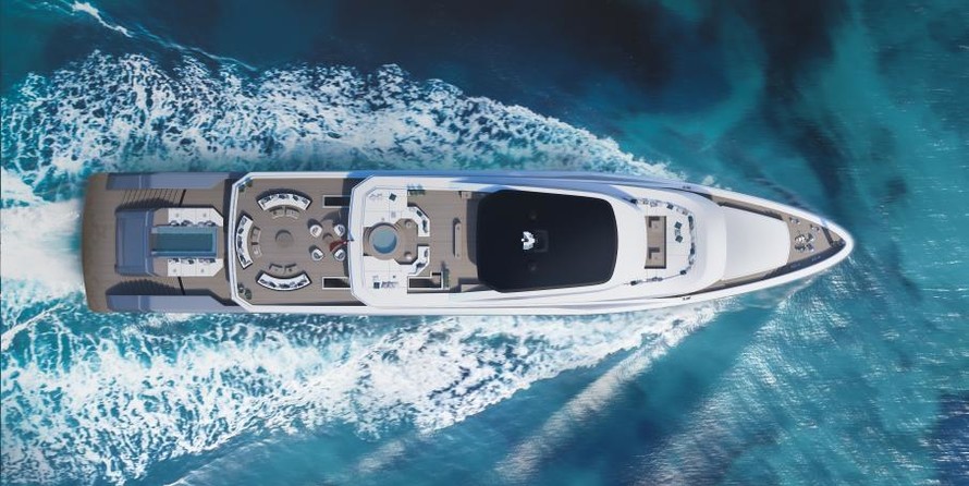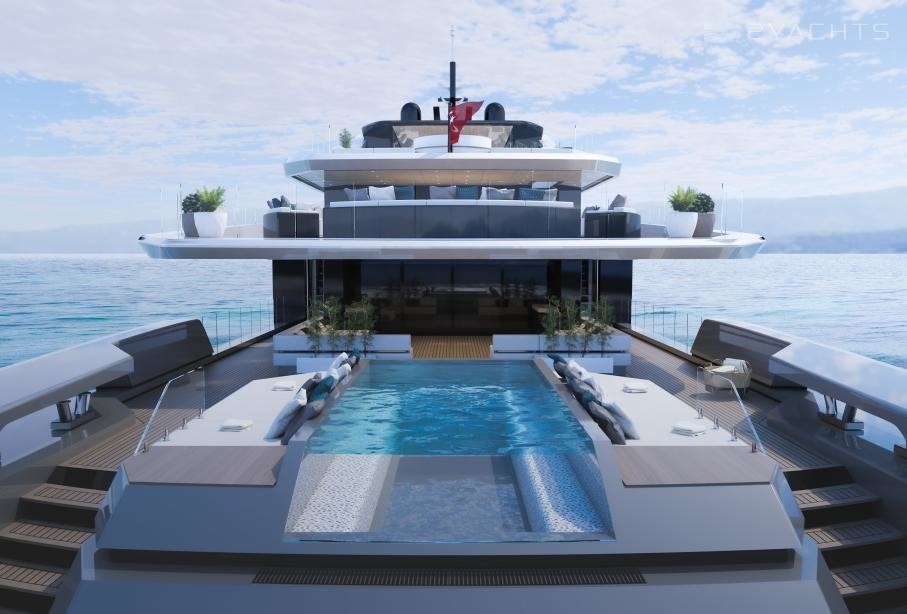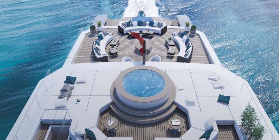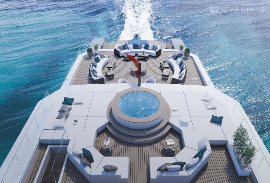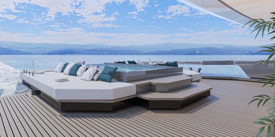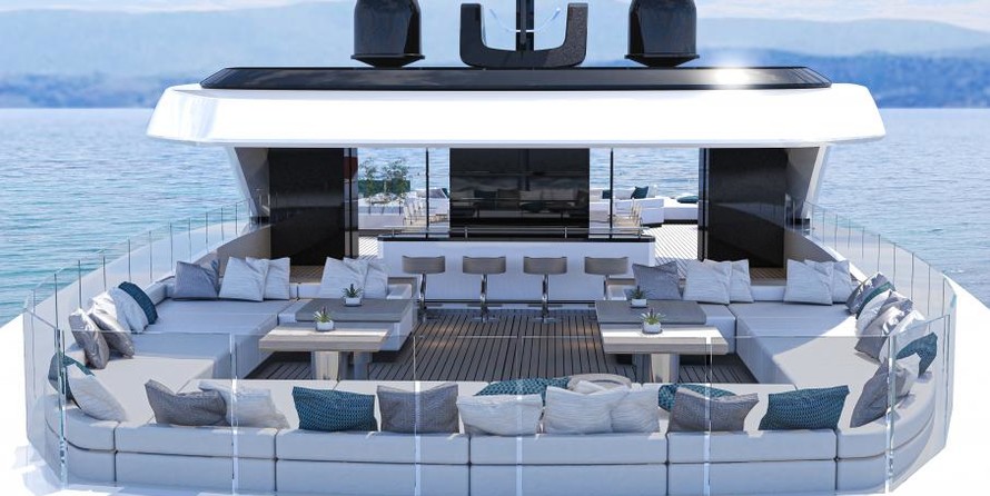 Un ponte al di sopra, sul ponte principale, poppa, invita a rilassarsi. Qui, a cinque metri di lunghezza piscina a sfioro tra adiacente sunpads verrà installato sul RMK 65. Di una zona salotto con due veri e propri divani forme di transizione verso il salone, che ha una superficie di 120 metri quadrati ed un'altezza di 2,30 metri, come quasi tutti i locali di bordo. Hot Lab propone per il layout e l'arredamento di un divano, di paesaggio, di un bar, di un pianoforte e di un tavolo da pranzo per un totale di 14 persone. Finestre dal pavimento al soffitto e un taglio nel baluardo invaderanno il salone con un sacco di luce naturale e collegare l'interno con l'ambiente il più intenso possibile.